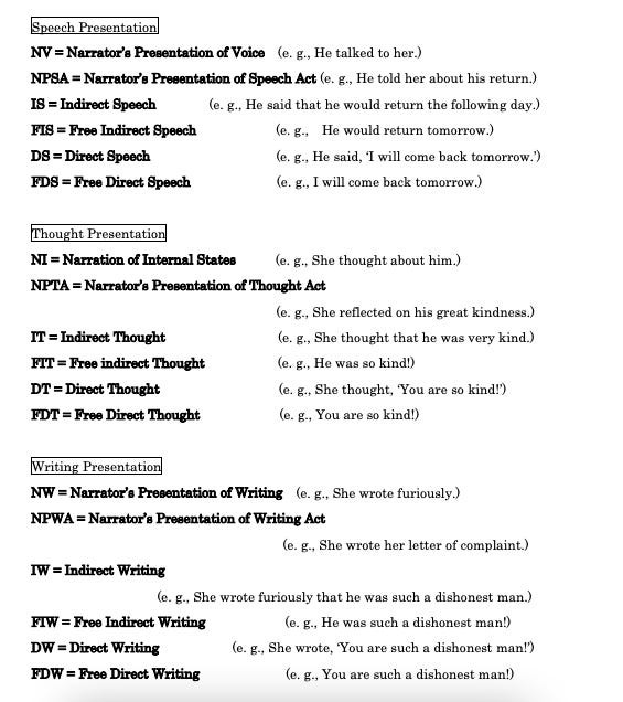 The critic Dorrit Cohn had made this distinction (using different terminology) in her seminal book Transparent Minds but said that Free Indirect Thought (which displays consciousness) was far more interesting. Critics have paid much more attention to Free Indirect Thought than Free Indirect Speech. Shimazaki wants to change that.2 She argues that critics became ideological about the way they examined these issues, and wanted a return to empirical scholarship.3