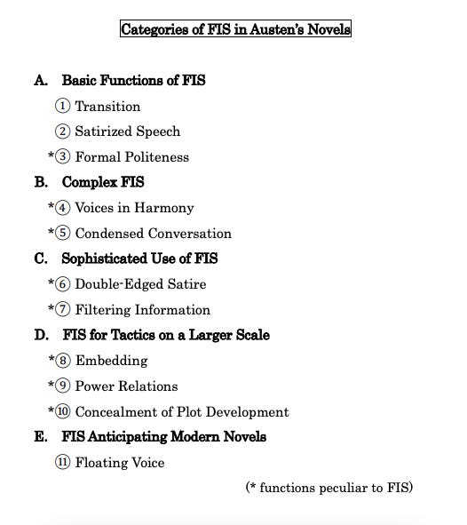 Shimazaki identified eleven types or uses of Free Indirect Speech in Austen’s novels. For instance: