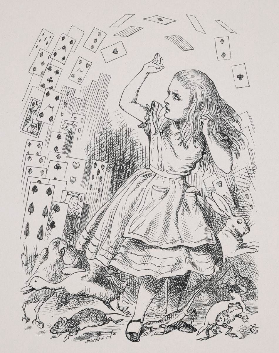 The only sure thing we can say is that Wonderland is a game: a dark game, maybe a nasty one in its undertones, but not one we should interpret too finely. That would be to miss the point completely. The game is played by its own rules. As Robert Douglas Fairhurst said, “Alice’s dream grows by feeding on itself.”