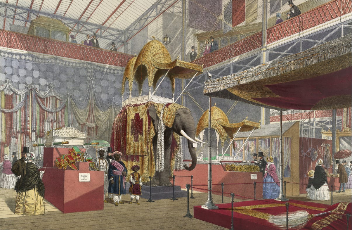 There was more than fanciful inventions like the Tempest Prognosticator—every turn in the exhibition brought you onto some new exotica, some new wonder: a royal Indian elephant, indoor trees, tableaus of stuffed animals, a tooth extractor. The Exhibition also has Smith’s comic electrical telegraph, a creepy-looking mask that moved through the use of electrical rods, creating all sorts of grotesque facial expressions.