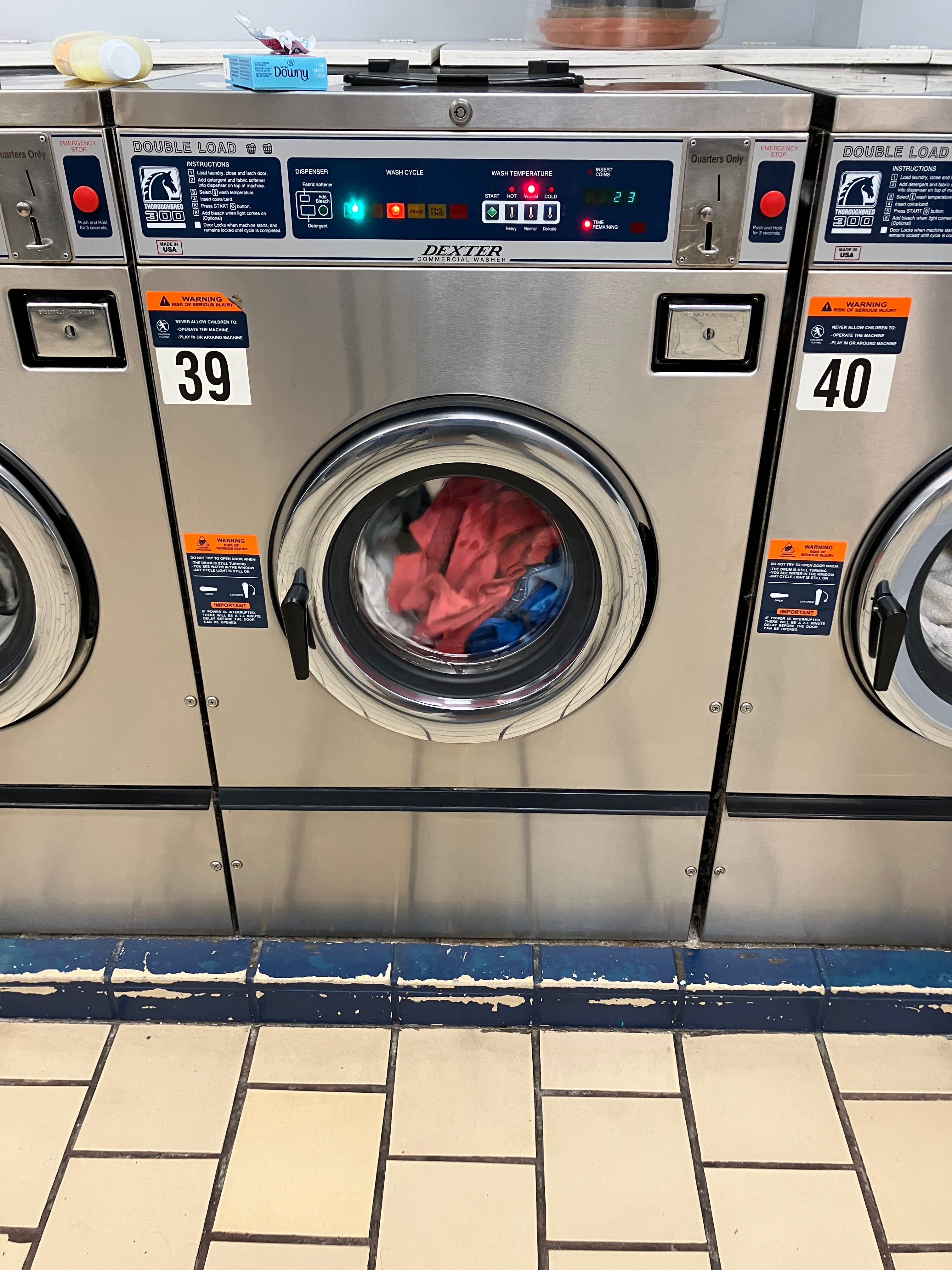At the laundromat, I saw far more men than women. By the time I left, it was about even. The young men looked at their phones while the older men stood like supervisory fathers watching their machines. I was one of two or three white people out of a group of twenty or thirty. Very little English was spoken, apart from by a man who seemed only to speak to himself. I did my laundry, including drying, for about $5. About two-thirds of the machines were in use at 10am on a Saturday. Many people brought their own little bottles of detergent, decanted at home. One man kept refilling his bottle at the sink and pouring the water into the machine. The two children who were there did all their chores willingly and pleasantly. Everyone there worked fast and according to habit, so it was easy for me to learn what to do by observing them. I asked two people for help: one seemed unable to reply, one was very friendly and showed me where to add the detergent. The Lutheran church across the road is enormous. Next door is a pawn shop advertising “CASH FOR GOLD”.