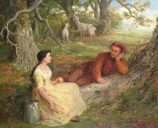 Rosalind collapses the distinction, but in a different manner. She is honest, like Audrey, giving Phoebe the rather blunt romantic advice, “you are not for all markets.” But look at that advice again: it is also witty. She wears her own version of a fool’s motley, which allows her to speak to Orlando with the kind of indirect honesty a fool is permitted with his master, but she is also pastorally simple in her romantic advice: “Men have died from time to time but not for love.”