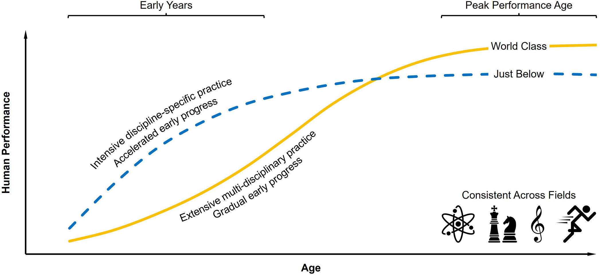 Those who are the very best in their field did not specialize early and did not outperform as teenagers. Instead they had above-average but not excellent early performance, with sustained long-term development.