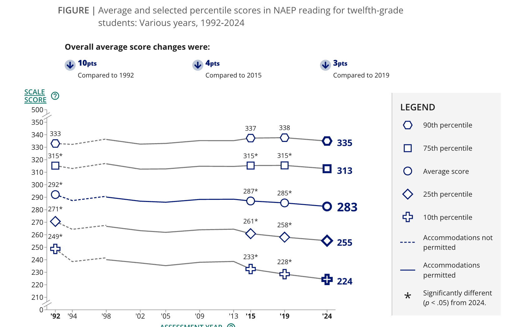 But when you get to the bottom ten percent of students, in particular, you really are talking about social rather than pedagogical problems per se. For example, chronic absenteeism. This has been way up post-covid. A huge proportion of the students in the bottom 10 percent of scores are probably not attending school at all regularly. Then there are English language learners, who now make up 10 percent of students; many schools don't have the resources to devote to them, so they get mainstreamed too soon and don't acquire the necessary skills. There are issues relating to discipline. There are problems that occur as a result of kids moving a lot because of housing instability and falling between the cracks as a result. There are the perverse incentives built into the system in terms of graduation rate. Of course we need to fix all of this! But it is amazingly difficult, and individual teachers or even schools probably can't do it without district and government support.