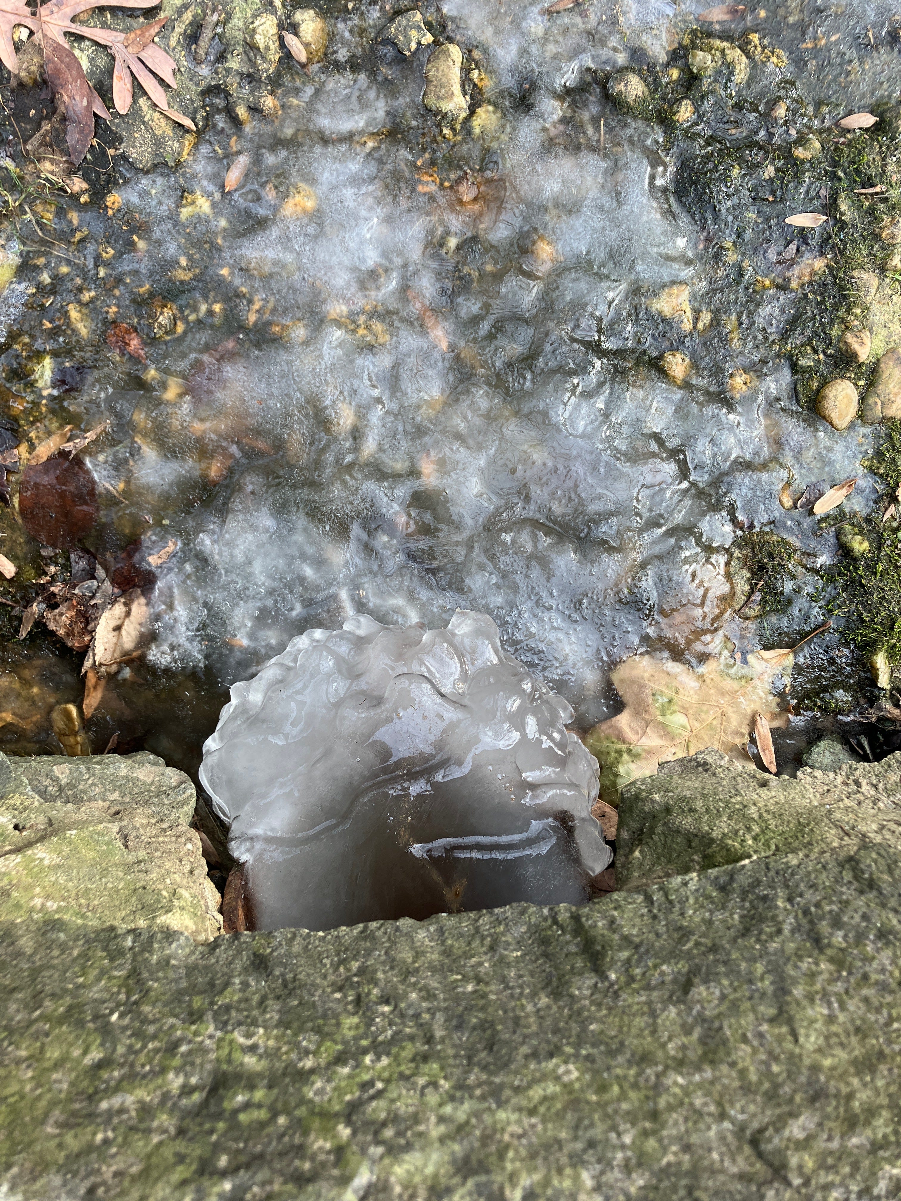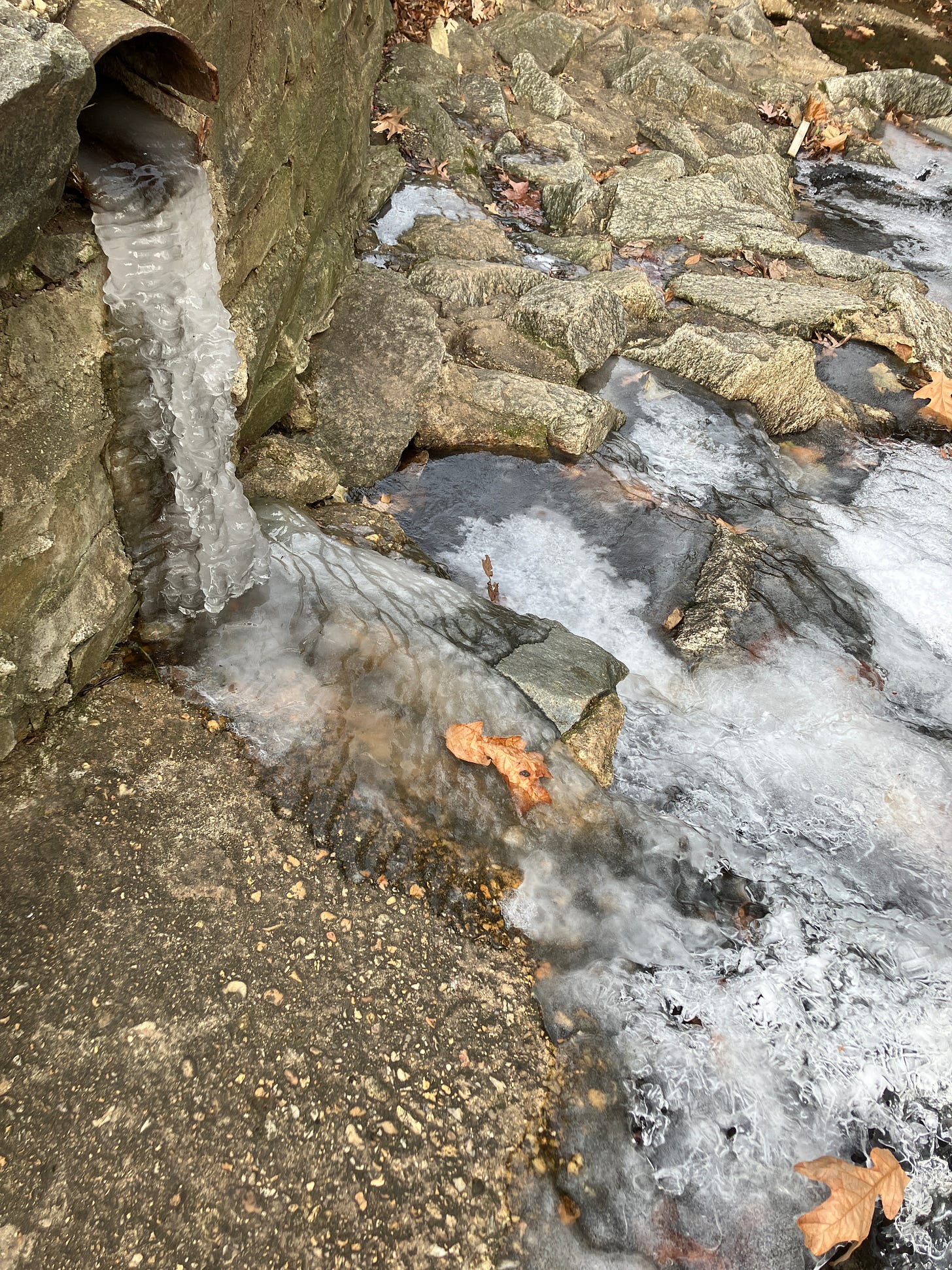 The day before the storm began, the creek froze over, nearly two inches thick, the water bubbling under the surface, pooling where it could, and the small waterfalls that pour out of overflow pipes froze solid, as if they had been stopped by the passing touch of a fairy’s finger. All the next day, ice fell from the sky. Inches and inches of settled snow, like a classic American cartoon, making little white caps on the street lamps, lining the tree branches like frosting, blanketing the ground in those undulations that animators mimicked so distinctively. Whenever a path was dug out, it filled in again by the time you turned to go back home. Everything was still. Standing under a small oak tree that kept its brown leaves, you could hear the falling ice, making a streaming-rattling noise, like rice grains pouring to the ground.
