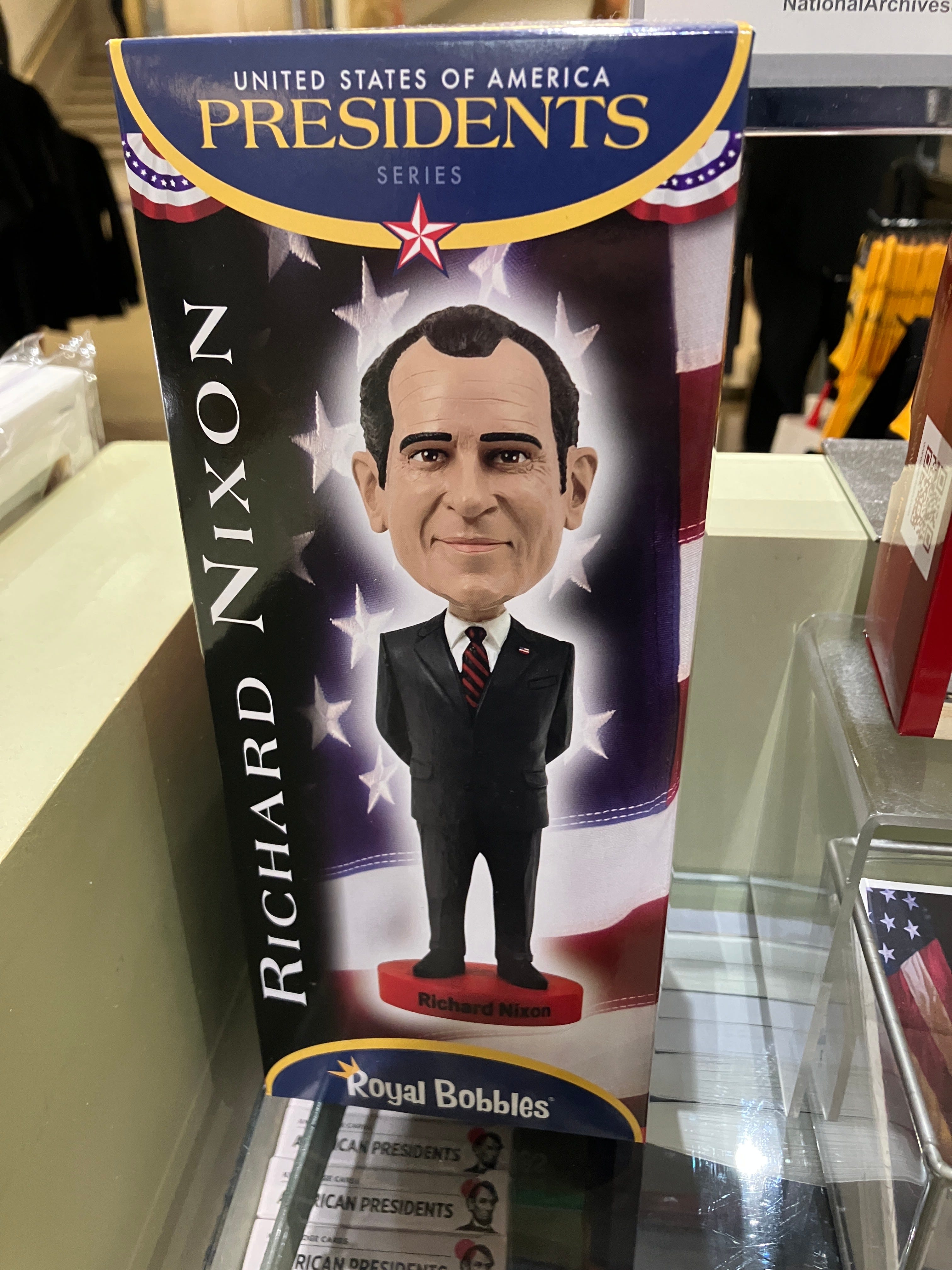 It exemplifies the American spirit that such dramatic respect is paid to these documents, in such semi-religious architecture, and that once you have paid reverence you visit the gift shop, where the Declaration of Independence is printed on a t-shirt and bobblehead dolls of President Nixon are for sale. One does not need to be high-brow to appreciate the miracles of political history.2