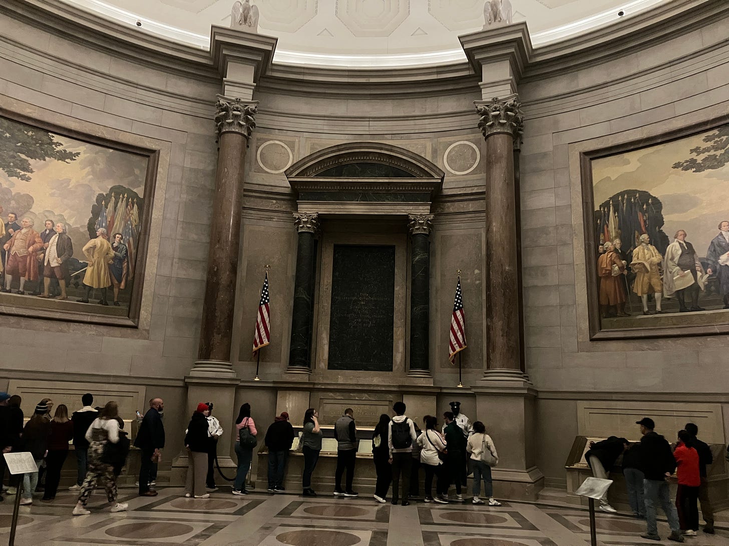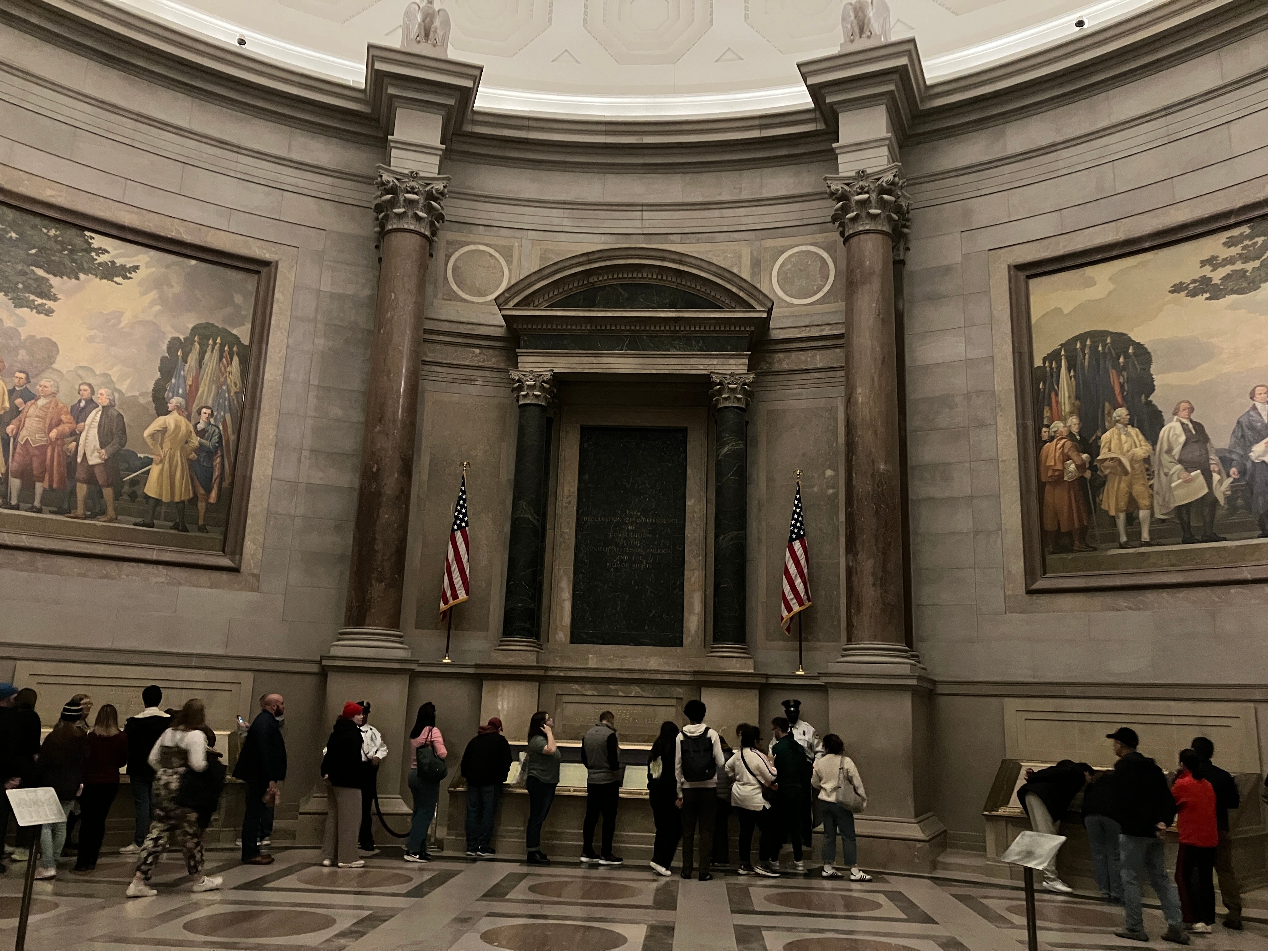 Upstairs in the rotunda, we saw just how seriously the Americans take their history. I am constantly told by regretful Yanks that their country doesn’t have real history like England. Pish! In the rotunda of the National Archives, behind the sort of huge metal gates once reserved for the holy ends of great cathedrals, we stood in line to see the Declaration of Independence, the Constitution, and the Bill of Rights.