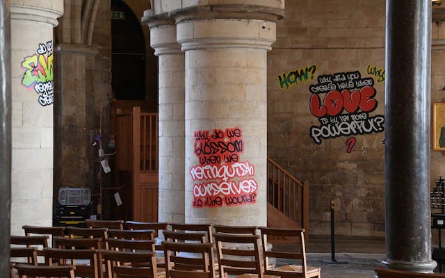 And so we arrive at the graffiti in the Cathedral which speaks to new audiences, which is not iconoclasm, not the forceful destruction and replacement of one order with another, but instead a diminished form of another set of ideas, a paltry ideological statement in garish colours, a stunt.