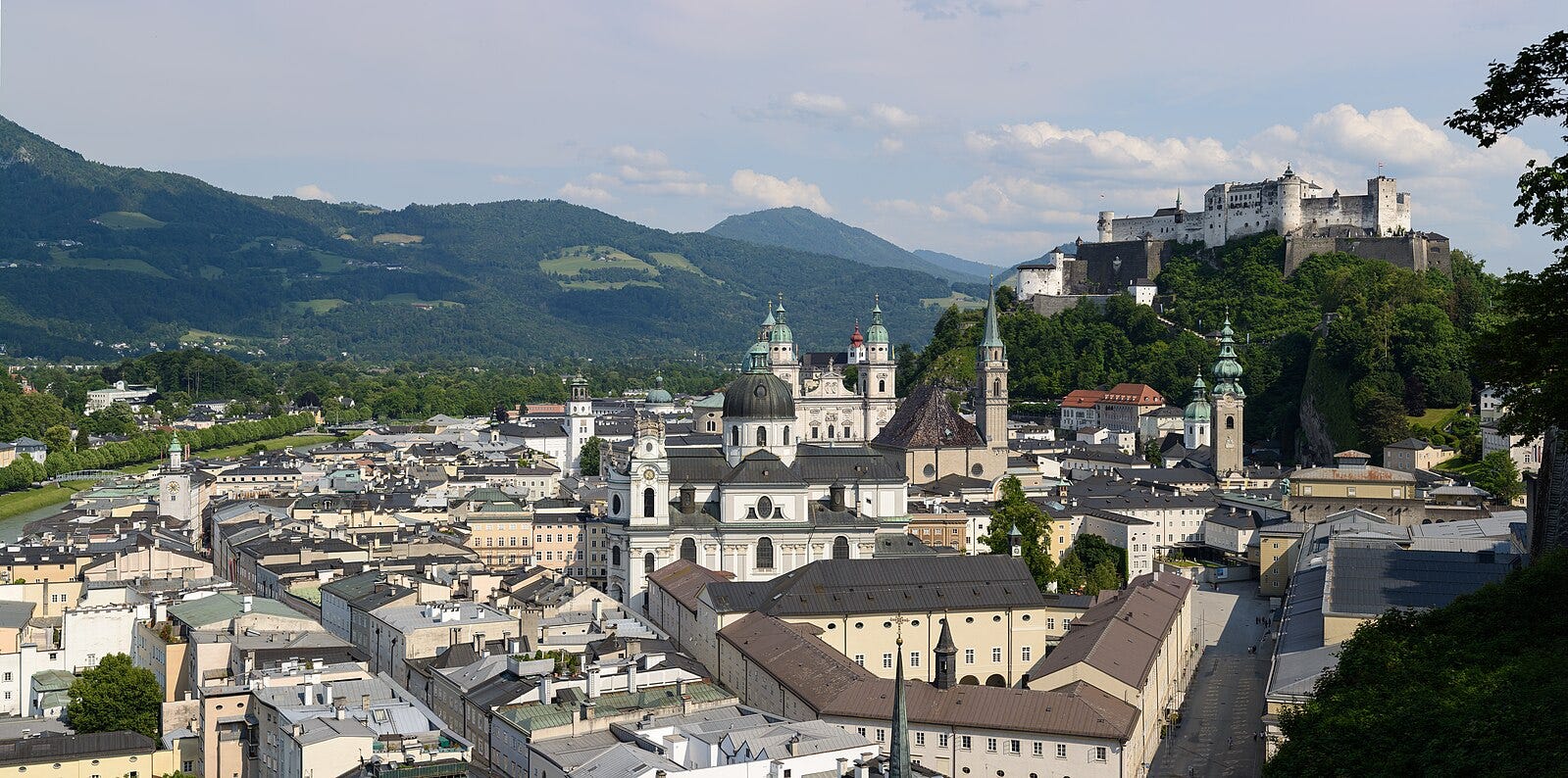 This scale makes the film’s main message much more prominent. As the camera pans down into Salzburg, away from the hills, an interstitial title appears: “Salzburg, Austria, in the last golden days of the Thirties.” Spires, towers, and steeples rise up against the background of the hills.