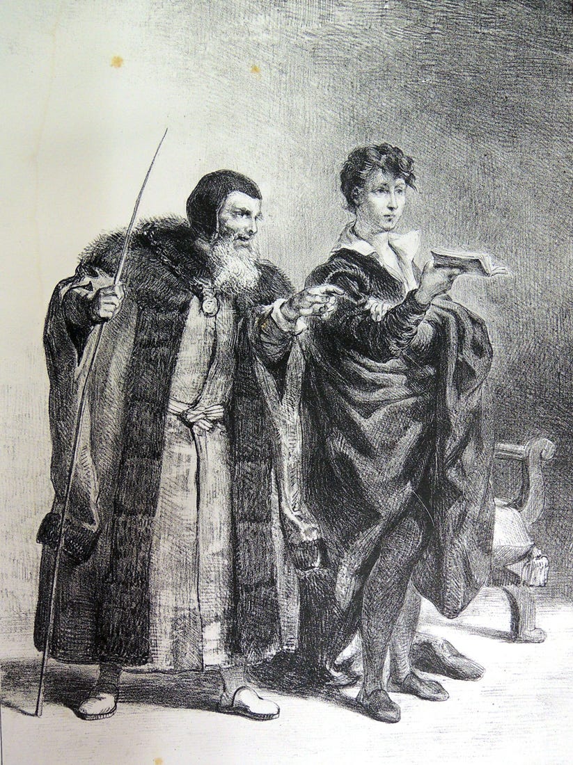 Delacroix made a series of drawings of Hamlet, based on Charles Kemble’s performance, which Baudelaire called delicate, pallid, soft and slightly hesitant.