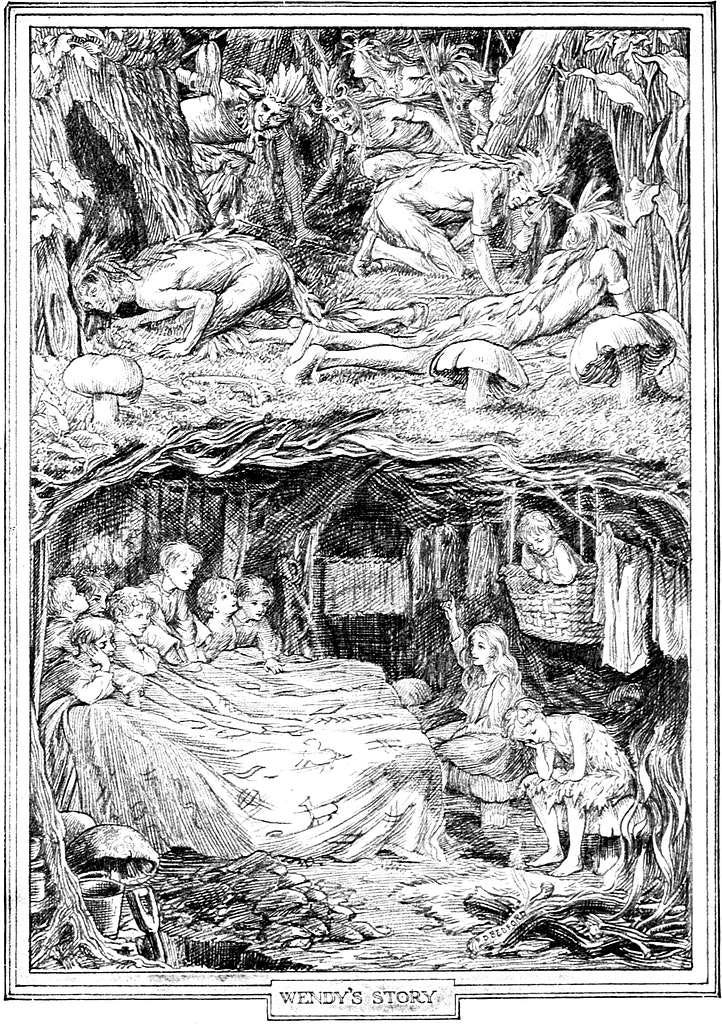 This is reflected in the way the children play. The Wendy house is built around Wendy while she lies (not quite) dead from the arrow—, and she instructs them from her unconsciousness, just as a child would in a game, being both the real and the imaginary at once, and seeing no contradiction in that mingled state. The joy is not merely that of seeing how well Barrie understands that way children play, (singing their instructions from their coma, pretending not to pretend,—which is part and parcel of “how it works in the game”), it is the joy, too, of seeing that childhood is a rehearsal for life, a state of both the real and the imagined.