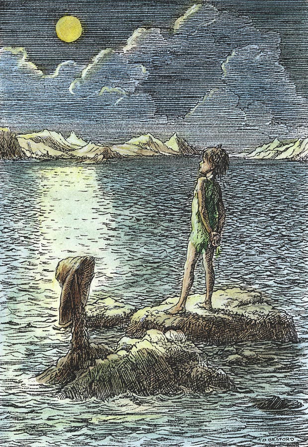 Children begin to enjoy this story when they are on the cusp of knowing both sides of Peter—, his great appeal and his terrible limitations. To meet a real Peter Pan in real life (someone like Edward VIII) is a horrible thing. Children know that Peter is not quite to be trusted. They want him to defeat Captain Hook; they also want Wendy to return to her mother, and to become a mother.