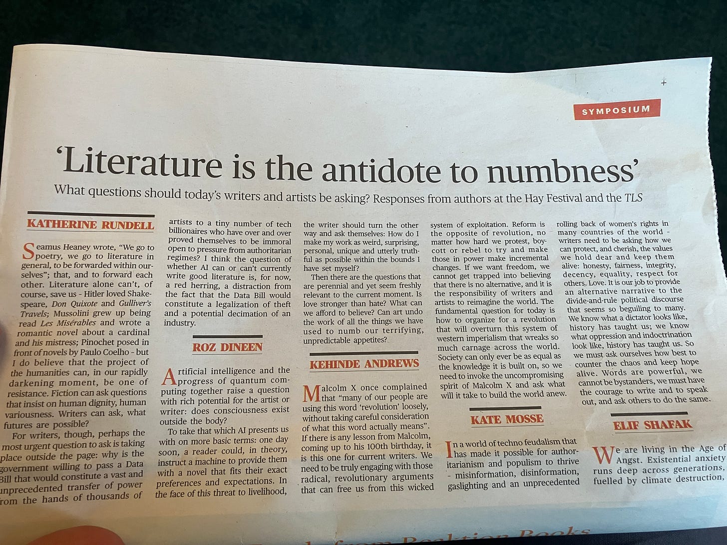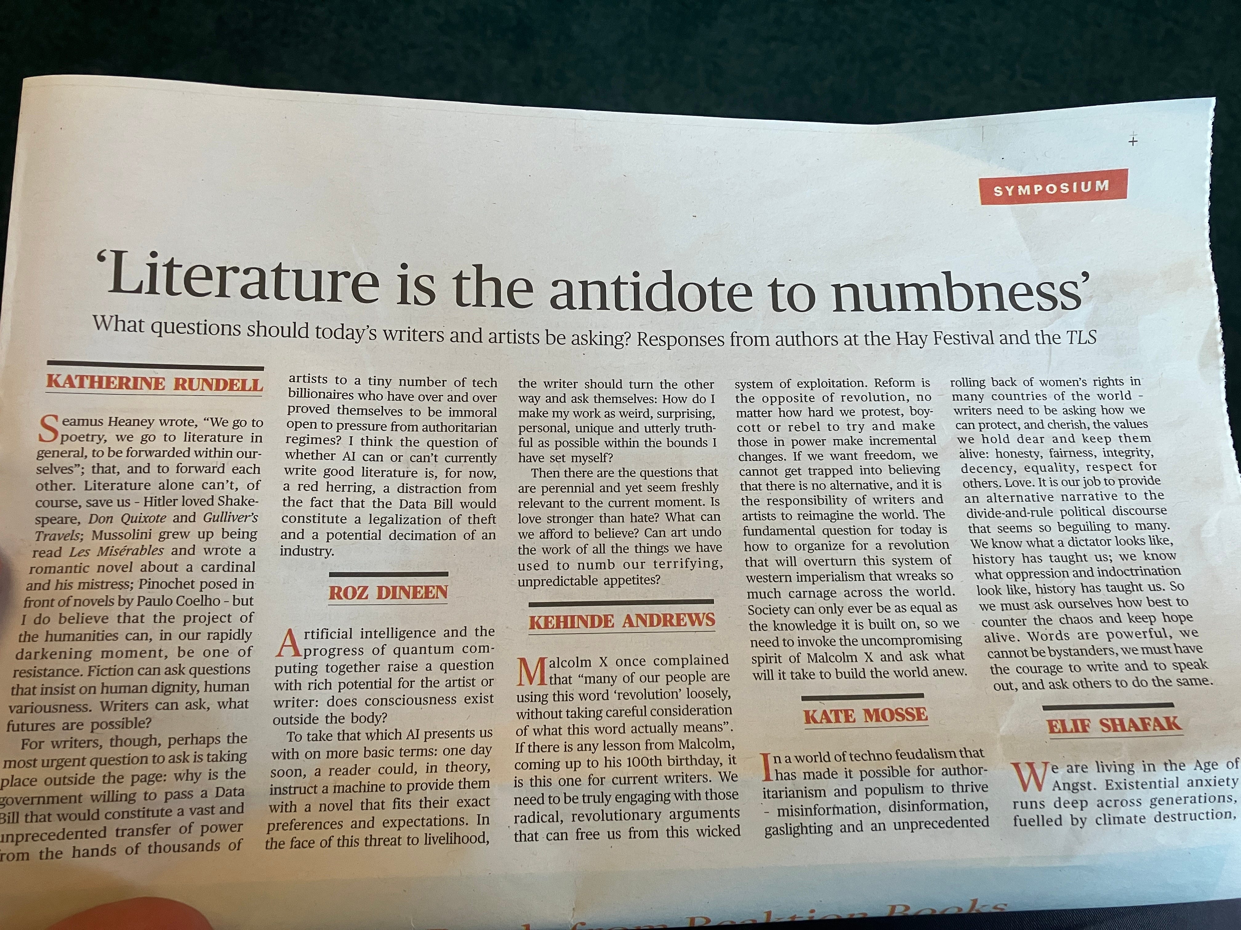 Katherine Rundell called billionaires immoral and said the Data Bill would be legalised theft. Several others used metaphors that didn’t say anything beyond “we need to ask difficult questions”. There was plenty of talk about “the texture of lived experience” and “the structures and systems we take for granted”. Tessa Hadley talked about writing novels, but the rest was mostly vague political commentary that wouldn’t other wise merit publication.